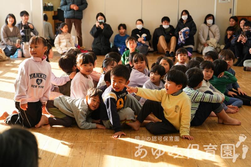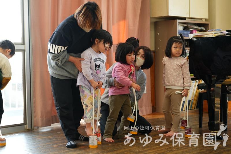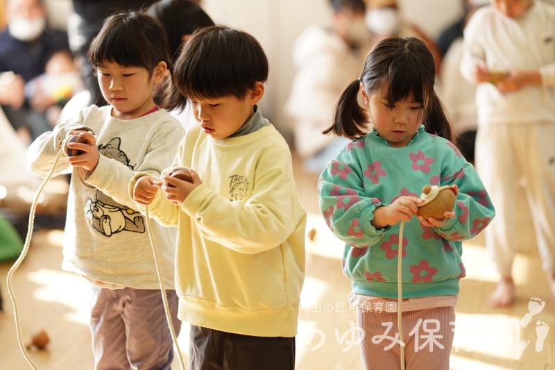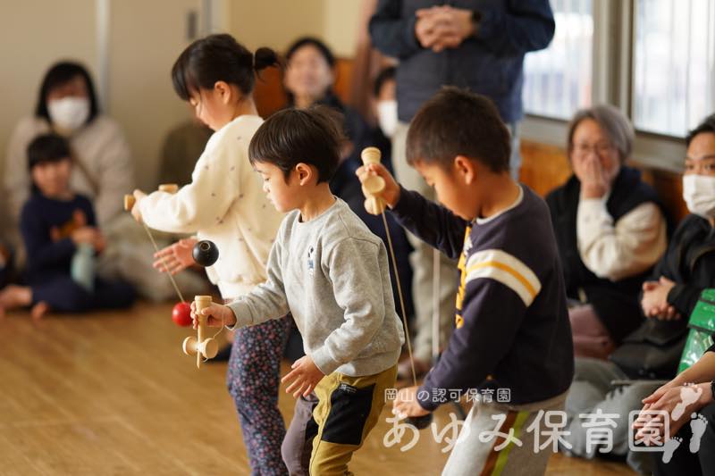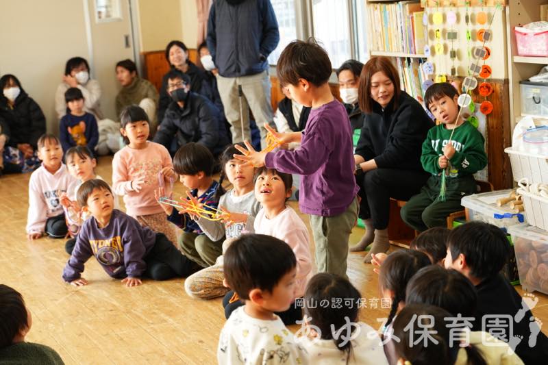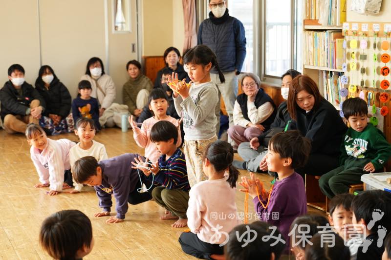 あゆみ日記 あそびと劇の会(前半) 2026年3月2日 by Web管理人 2月21日(土)に「あそびと劇の会」を行いました。 はじめは各クラスに分かれて朝の集まりをしました。あじさい組は絵本の読み聞かせのあと、日頃練習していた あやとり や けん玉、ひもごま を披露しました。 とんぼ組は缶ポックリをして、終わったあとにはパンなどをもらいました。 あそびと劇の会の後半ではあじさい組が劇を発表しました。その様子は別のブログ記事にします。 Web管理人